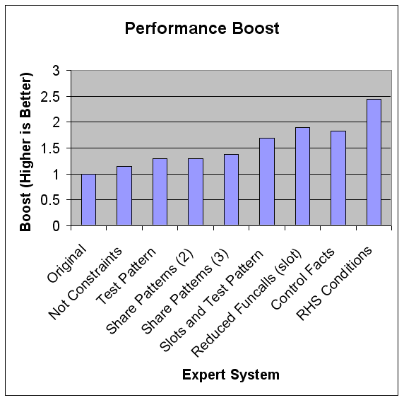Try Control Facts We are going to try one more optimization technique in this article: control facts (see newsletter 4 for details, http://riversoftavg.com/NewsLetters/newsletter2001AprMay.htm#Tip:%20How%20to%20partition%20your%20rules). The idea behind control facts is that these facts control which rules get activated based on the value in the control fact. The traditional idea is to have a "phase" control fact, which could have values of initialization, decision, action, etc. Rules are written for a particular phase by putting the control fact in as a rule pattern: (defrule control-fact-rule (phase initialization) (other-patterns) => ) Not only are control facts good for partitioning your expert system but they also can help the inference engine work less too. If a specific control fact is not present, rules that need that control fact will not evaluate any more patterns. The rule above would not evaluate (other-patterns) until the (phase initialization) fact is present. Our example expert system is not a good candidate for control facts, but let's try it and see. We will define a is-high-number fact template. This fact will only be present when the number fact is above 500. Then, we can rewrite the rules based on whether they are looking for a high number: (defrule match-and-add-01 "match numbers and add 1" (not (is-high-number)) ?f1 <- (num (n0 ?n)) (test (and (>= ?n 0) (< ?n 100))) => (modify ?f1 (n0 (+ ?n 1) )) ) ... (defrule match-and-add-06 "match numbers and add 1" (is-high-number) ?f1 <- (num (n0 ?n)) (test (< 499 ?n 600)) => (modify ?f1 (n0 (+ ?n 1) )) ) Now, half of the rules won't even be evaluated every time the number fact changes because they have been "disabled" by the control fact. In theory, this will reduce the number of pattern match checks and function calls. In practice, we need to see if the overhead for the control fact outweighs the benefits. We need to write one more rule which will assert the control fact once the number gets high enough: (defrule check-if-high-number (not (is-high-number)) (num (n0 ?n&:(>= ?n 500))) => (assert (is-high-number)) ) Ok, let's finish rewriting the rules ("Simple ES, Reduced Funcalls (slot) Control Facts.ie"), load the expert system, and run. Darn, 83% improvement, less than the previous expert system. In this case, control facts don't help us. Interestingly though, even though we have one extra rule and one extra fact, we didn't lose much speed. It is easy to see that in other cases where there are perhaps more rules, more patterns, or more expensive functions, the control facts optimization would help us. One more point about control facts, the control fact should usually be the first pattern in a rule. Otherwise, the other patterns would be evaluated first before the control fact could ever help us. Just rewriting the rules and putting the control fact last ("Simple ES, Reduced Funcalls (slot) Mistake Control Facts.ie") makes the expert system 10% slower than when the control facts are at the beginning. Conclusion Ok, that's it. By a few judicious optimizations, we have gotten almost twice as fact as the original expert system. If we collapse all the rules into one rule, in this case, it would work for us and give us almost 2.5 times the speed! The chart below shows our results.